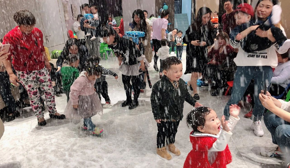 生日会将近尾声,冰雪公主从冰雪王国带来的雪花,瞬间活动中雪花漫天飞舞....